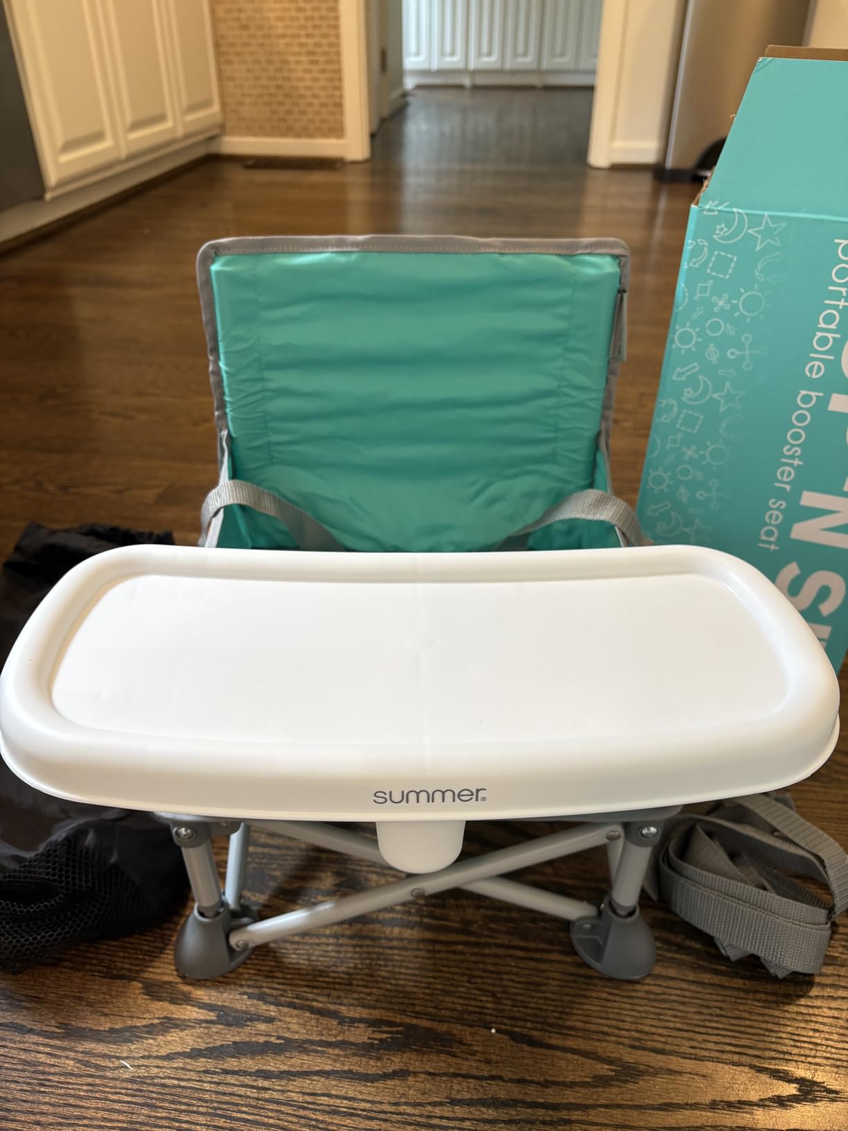 Compact design folds down to 5 × 15″, easy to carry in the included bag. Safe for indoor/outdoor use with a 3‑point harness and BPA‑free tray. A handy extra seat for playtime or mealtime anywhere