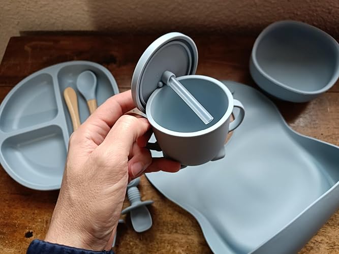 - Baby Led Weaning Supplies: Our silicone bib is designed with a deeper and sturdier pocket, making it highly effective in catching dropped food and easy to clean. The adjustable circular design is particularly gentle on your baby's skin. Our training cup is expertly crafted to fit snugly in your baby's small hands and mouth, safeguarding their developing teeth. Furthermore, the straw is equipped with a spill-proof function, aiding babies in transitioning from breastfeeding and promoting independent drinking.